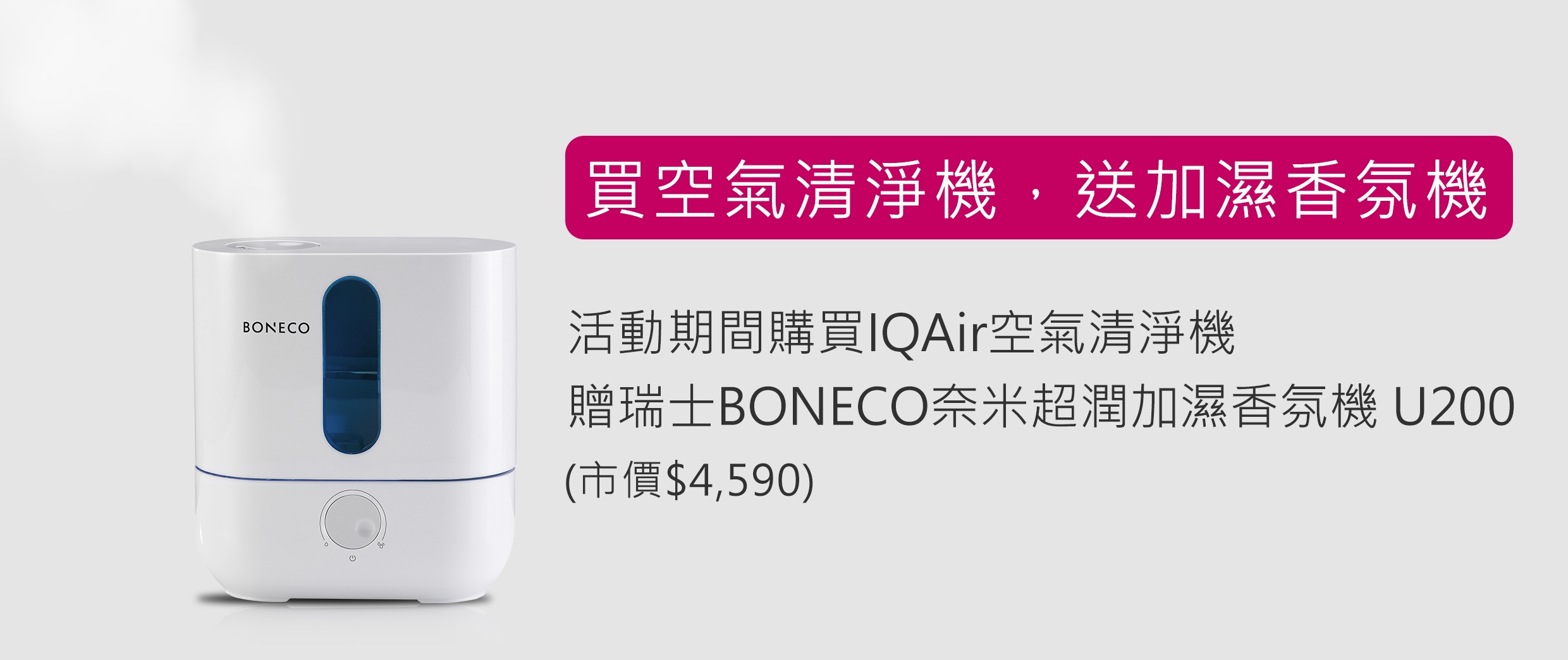 2026年度購機優惠活動活動內容 | 選購任一款空氣清淨機,即贈 瑞士BONECO 奈米超潤加濕香氛機 U200。